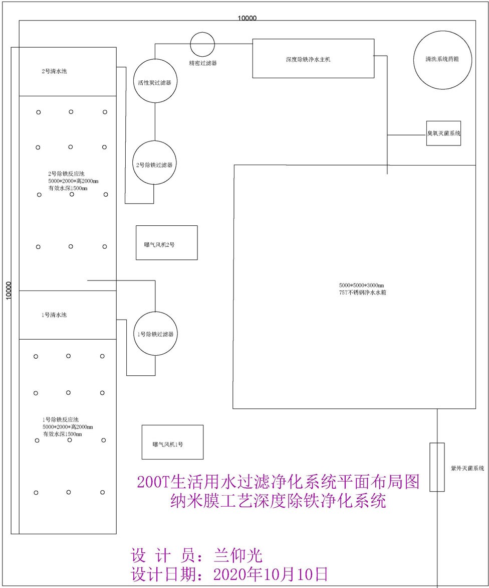 原水(井水)→氧化處理→增壓泵→1號(hào)錳砂過(guò)濾器→2號(hào)錳砂過(guò)濾器→活性炭過(guò)濾器→精密過(guò)濾器→納濾膜除鐵→凈水池。